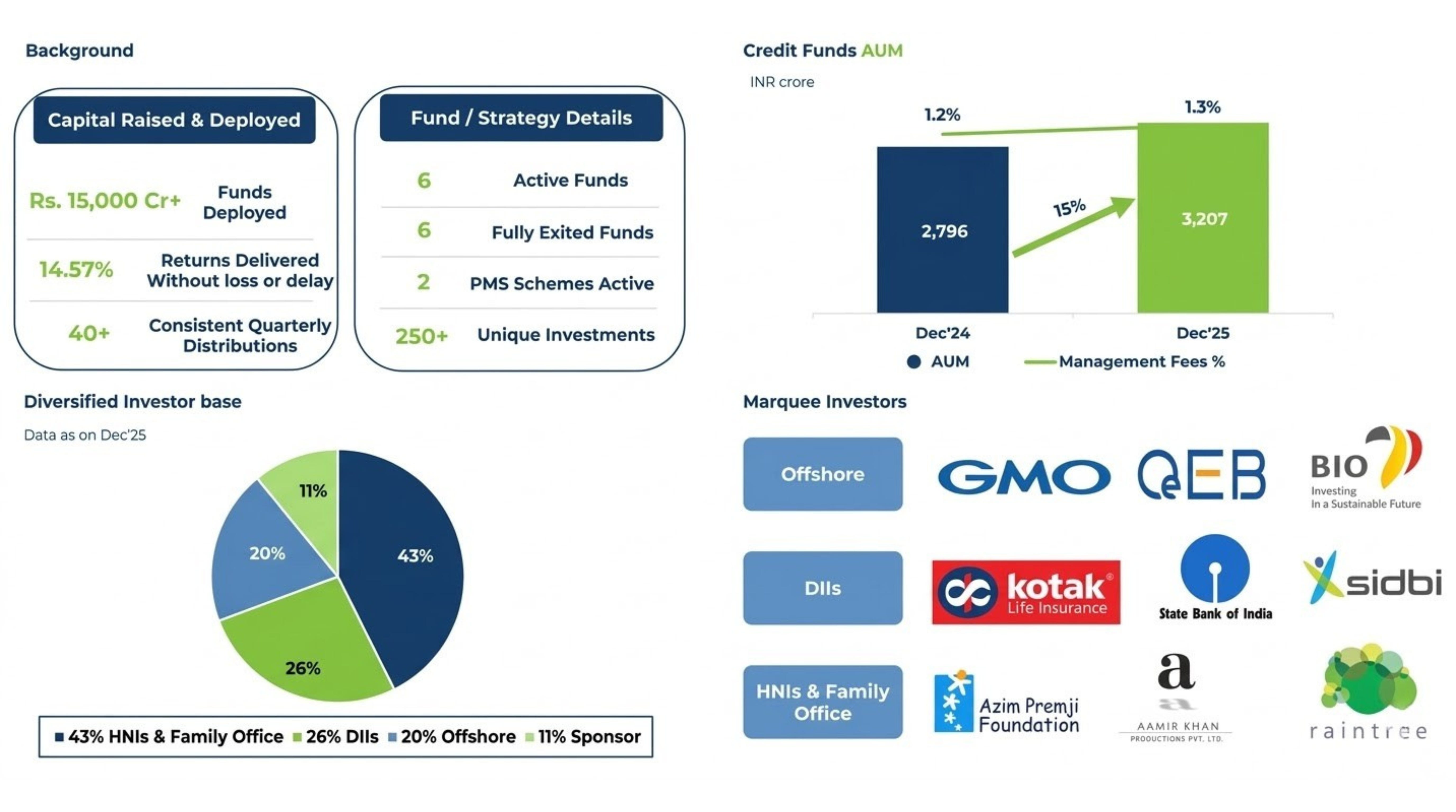 Northern Arc Asset Management (NAIM) manages ₹3,207 crore across 6 active credit funds. Another 6 funds have been fully wound down and exited all ahead of target returns. One fund targeted 13.5% IRR and delivered 14–17%. 1,200+ investors across institutional and semi-institutional categories.