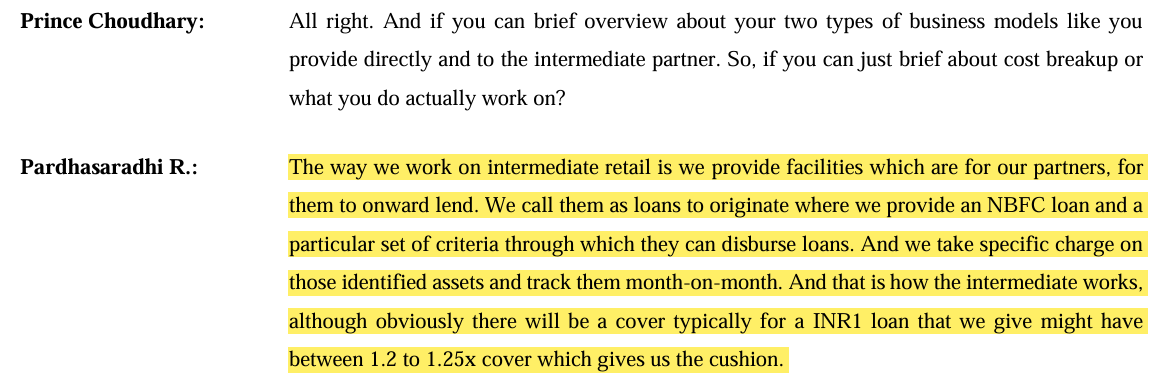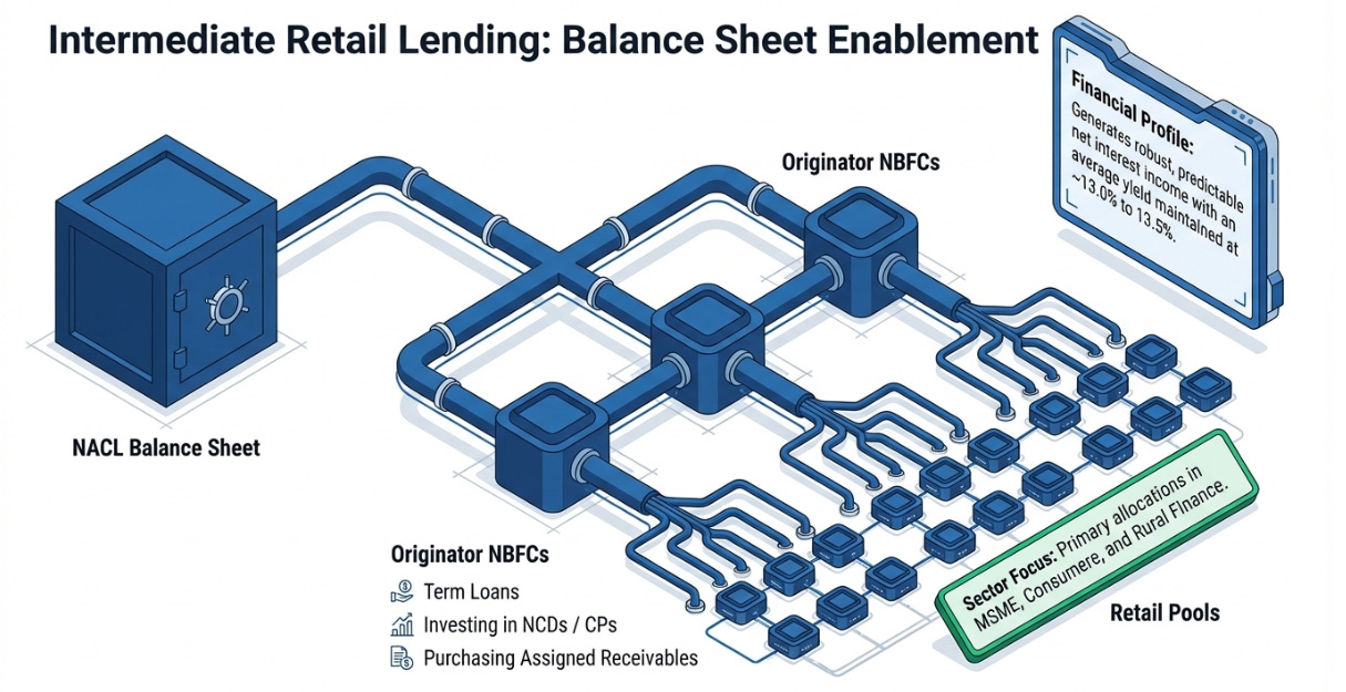 Intermediate Retail Lending (IRL) is lending to other lenders- the “originator partners”—rather than to the final borrower. As of Q3 FY26, this book stands at about ₹6,629 crore, roughly 44% of total AUM.