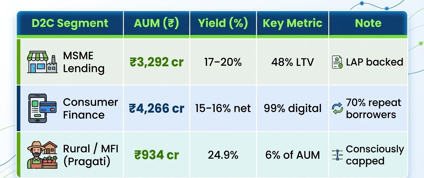 The D2C pivot began as a logical response to a margin problem. As a pure wholesale/infrastructure lender, Northern Arc’s spreads on Intermediate Retail Lending are 3–3.5%. Reasonable, but thin. If you can lend directly to MSMEs and consumers instead, and earn 17–20% on LAP and 15–16% net on consumer digital, the NIM improvement is immediate and substantial.