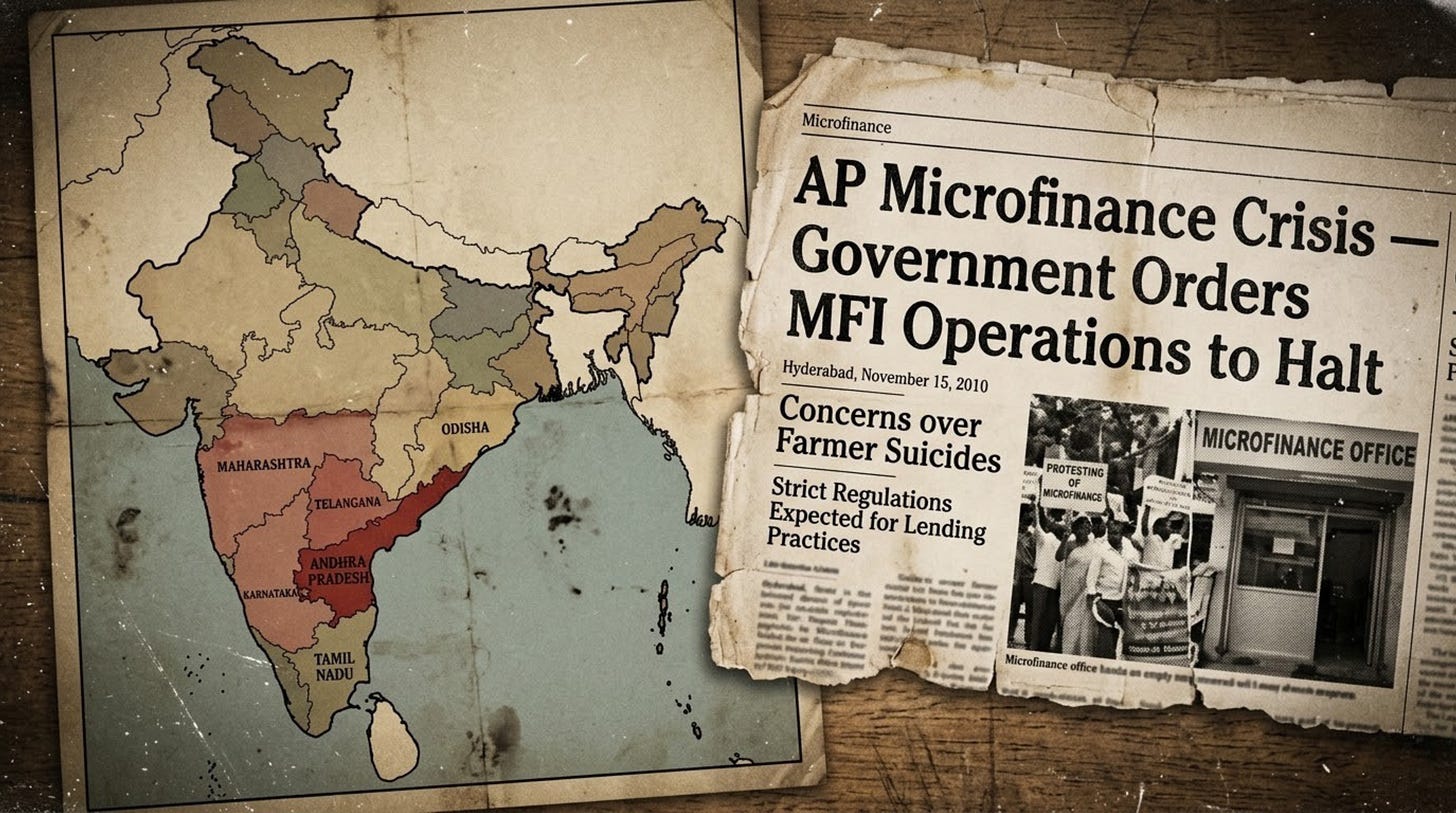 In 2010, the microfinance sector experienced what might be called its first proper near-death experience. The Andhra Pradesh government issued an ordinance that effectively halted MFI lending operations in the state. Overnight, the cash flow assumptions underlying billions of rupees of MFI debt became worthless. Banks and wholesale lenders who had deployed capital into the sector without understanding the underlying risk were suddenly holding assets nobody could price.