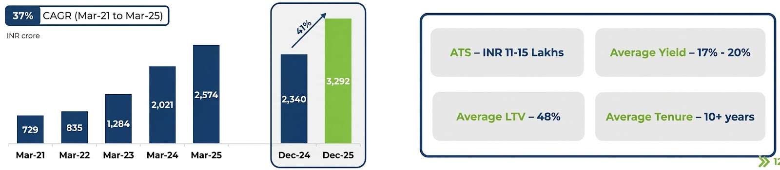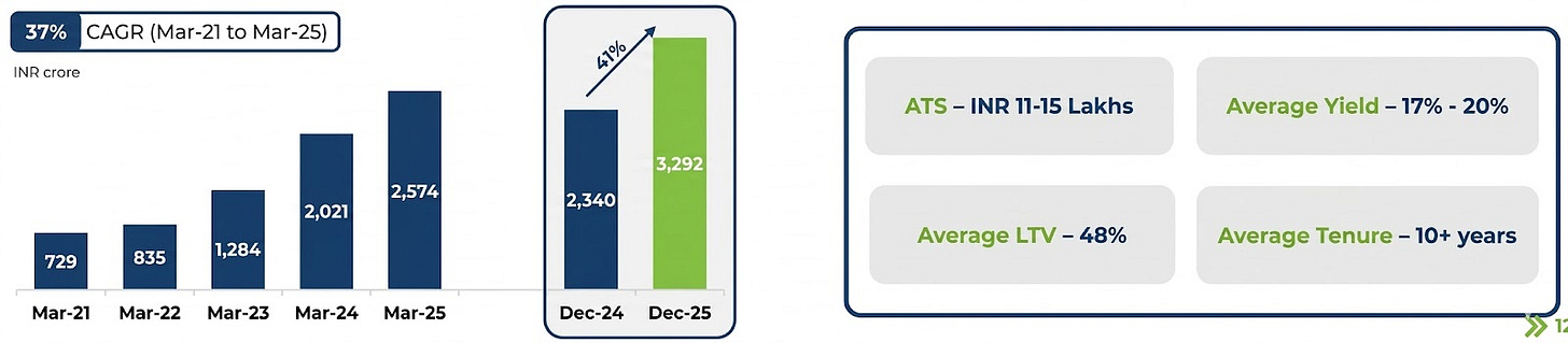 Northern Arc’s MSME book is built around Loan Against Property: tickets of ₹11–15 lakhs, loan-to-value (LTV) ratios of 48%, tenure of 3 - 10 years. These are semi-formal business owners, proprietorships, small manufacturers, traders who own property but lack the income documentation that a traditional bank requires.