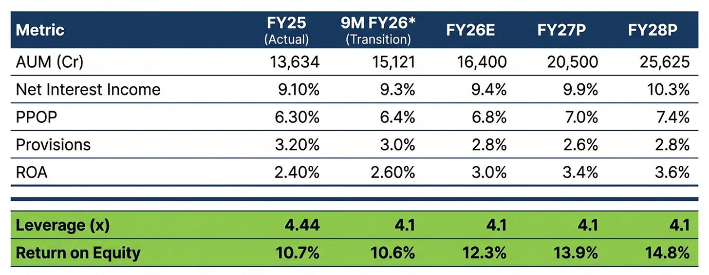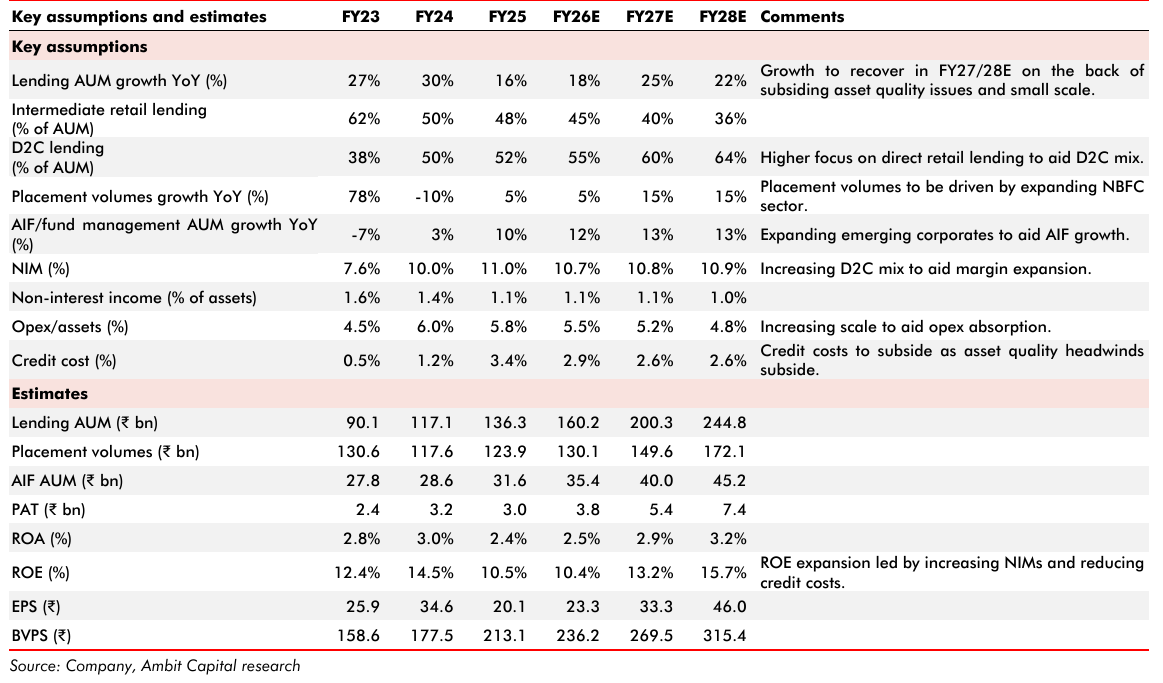 The base case (approximately 2x FY28 book): Credit costs normalize to 2.5–3.0% or below by FY27. D2C grows to 75% of total AUM without materially impairing IRL. NuScore SaaS gains three to four anchor clients. ROA expands to 3.4–3.6% and P/B inches towards 2.0x or higher.